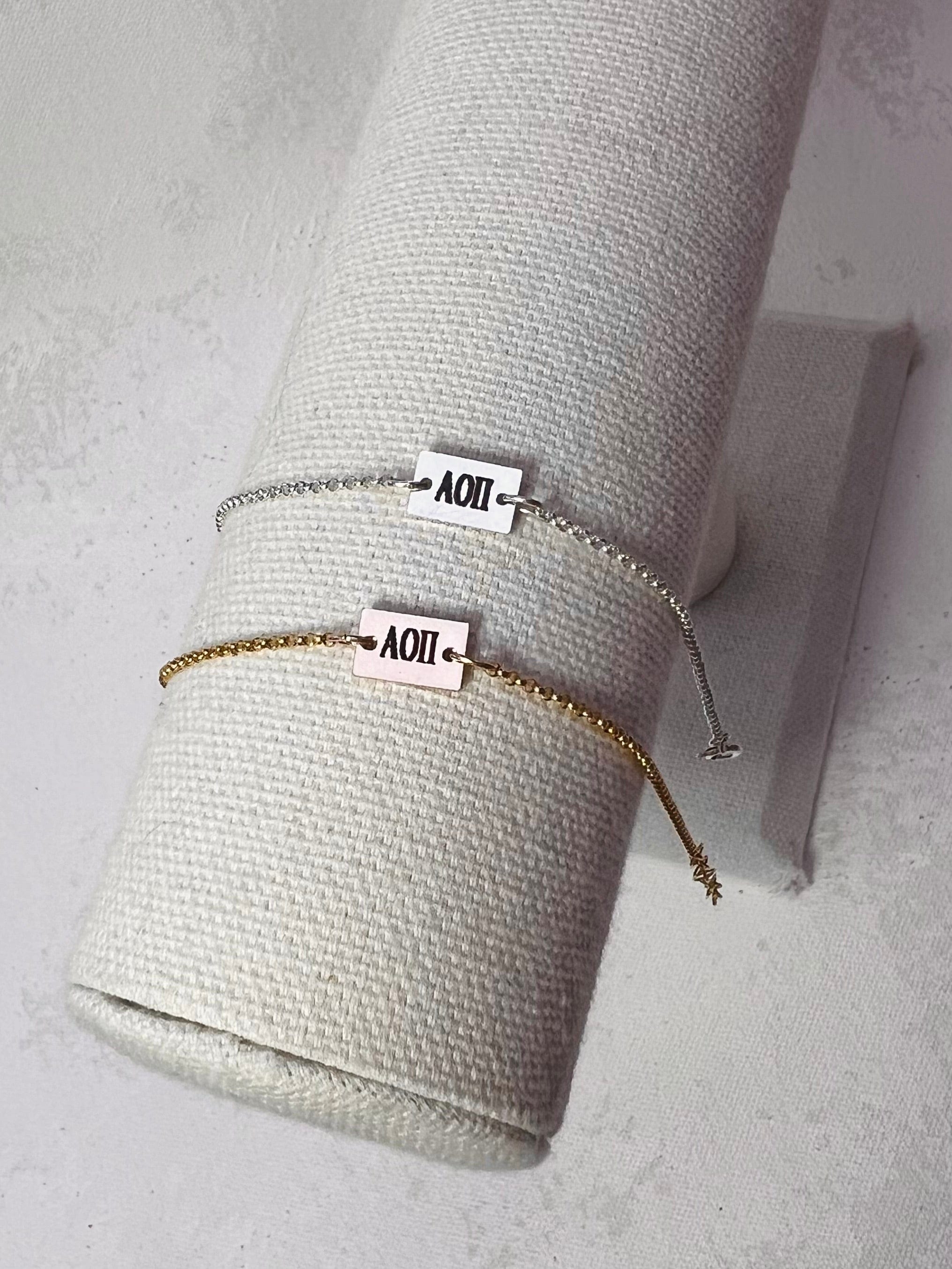 Our gorgeous sorority bracelet is a stunning addition to your stack! The mini bar charm bracelet is available in 14k gold fill (not plated) and sterling silver, so it's water friendly and ready for a busy lifestyle.