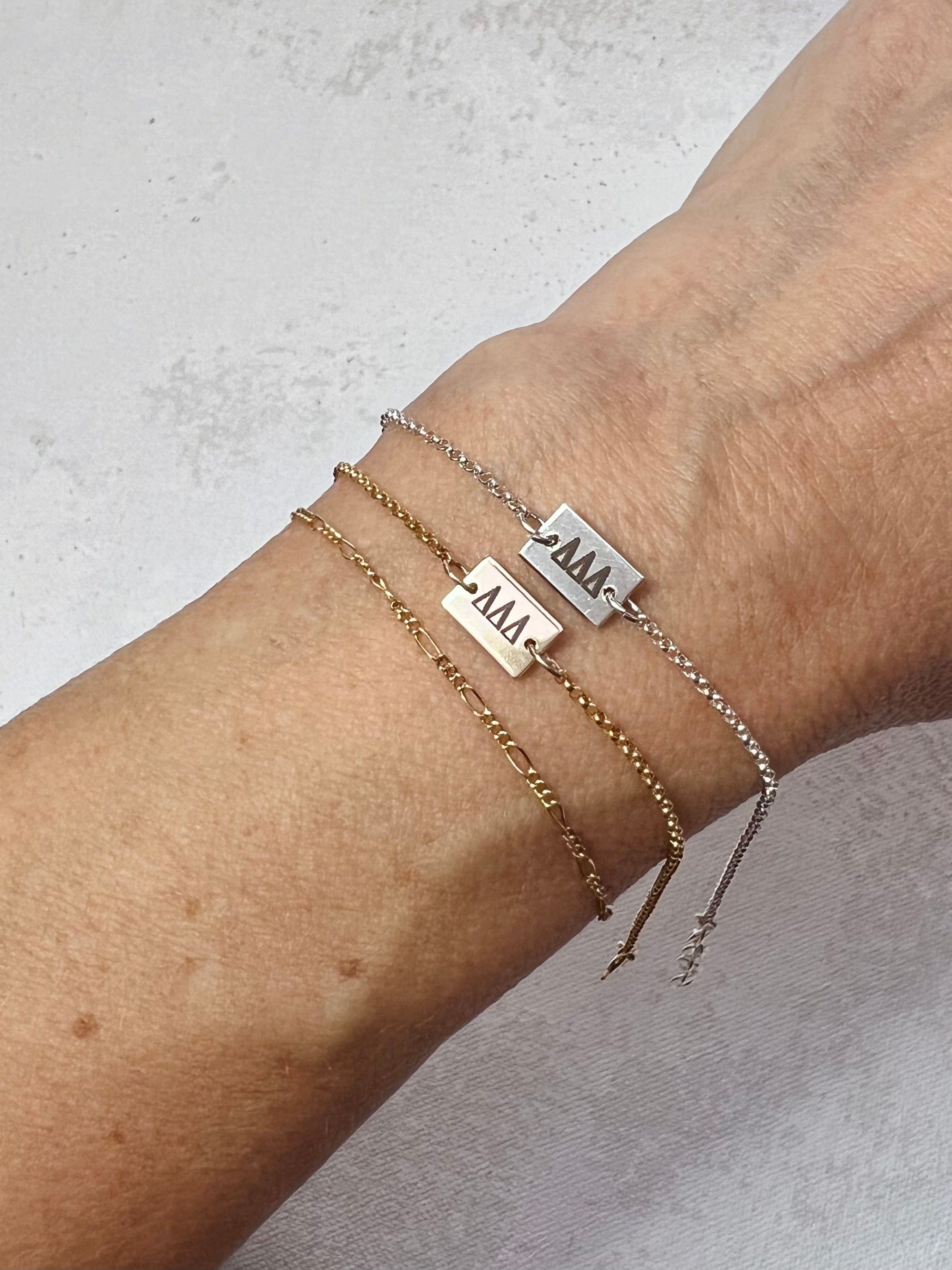 Our gorgeous sorority bracelet is a stunning addition to your stack! The mini bar charm bracelet is available in 14k gold fill (not plated) and sterling silver, so it's water friendly and ready for a busy lifestyle.
